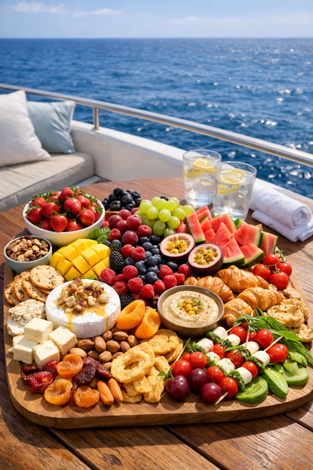 A beautifully arranged selection of fresh fruits, light bites, and nourishing elements to enjoy during your ocean journey.