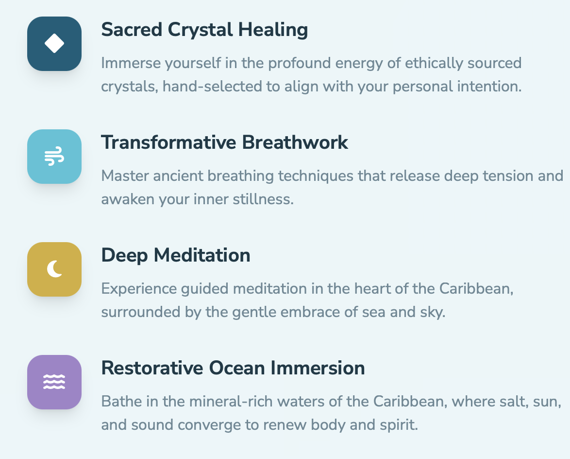 A luxury ocean healing experience combining crystal rituals, meditation, and the restorative energy of the Caribbean Sea.